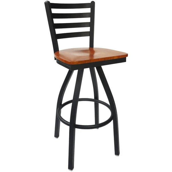 Seat your patrons comfortably at any bar or cafe with the BFM Seating 2160SCHW-SB Lima bar height swivel chair. Its back rest features a ladder design that provides unmatched comfort while maintaining a distinct look for your restaurant. The swivel design allows patrons to turn in their chairs to comfortably socialize and fully enjoy your venue. A contoured, cherry-finished wood seat brings exceptional comfort. Its steel legs are all connected with supports to ensure superb stability, while white nylon glides are capped on the bottom of the legs to protect your floors for years to come at your pizzeria, bar, deli, or restaurant. Overall Dimensions: Height: 42″ Depth: 18 1/4″ Seat Width: 17 1/2″ Seat Depth: 16 1/2″ Seat Height: 30″ Capacity: 250 lb.