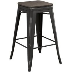 Whether patrons are cozying up to your bar at happy hour, indulging in a delicious breakfast, or watching the world pass by in your window-side dining area, this simple yet attractive BFM Seating 2510BMHW-SB Trent sand black metal barstool is sure to present them with a comfortable place to perch! Contoured for comfort, the mahogany wooden seat also features sleek coloring to add a distinct visual appeal to your restaurant, bar, cafeteria, or game room. The sand black metal frame gives the chair a durable, stable foundation for a weight capacity of 250 lb., and it also includes glides at the bottom of each leg to help protect your floors. Designed to slide smoothly, these glides ensure that the stool moves quietly to keep unwanted noise to a minimum. Plus, an integrated footrest adds further support and comfort your customers will love. Overall Dimensions: Seat Width: 16″ Seat Depth: 16″ Seat Height: 30″ Capacity: 250 lb.