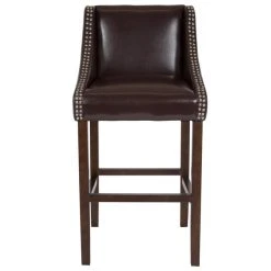 Dine and drink in style with this classy Flash Furniture CH-182020-30-BN-GG Carmel Series brown leather bar stool with walnut frame and nail trim. This stool is a perfect addition to any space and is comfortable enough to relax in and elegant enough to complement brighter decor in a well-lit room as well. This classy bar height stool features a deep seat, supportive back, and nails accenting the curve of the arms. The LeatherSoft upholstery mimics the look and feel of real leather, but with added softness and durability to withstand constant use. In the absence of product-specific restrictions and weight limits, normal usage means use for no more than 40 hours per week by persons weighing 250 lbs. or less. This stool features added safety in the fire retardant foam padding that cushions the seat and back of the barstool. The sturdy walnut frame has a foot rest for added comfort and stability and is finished off with protective rubber floor glides to ensure the chairs tuck in smoothly and that your floors stay free from scuffs and scratches. The sleek brown LeatherSoft upholstery seamlessly complements the walnut frame making this barstool easy to pair with the table or bar of your choice. This bar stool is not intended for commercial use. In the absence of product-specific restrictions and weight limits, normal usage means use for no more than 40 hours per week by persons weighing 250 lbs. or less. Overall Dimensions: Width: 20″ Depth: 22″ Height: 42″ Seat Dimensions Width: 17″ Depth: 17″ Height: 30″ Back Dimensions Width: 16″ Height: 13 1/2″