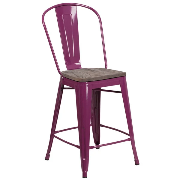 Bring excellent, reliable seating to any urban or modern dining area with the help of this Flash Furniture ET-3534-24-PUR-WD-GG 24″ purple metal counter height stool with vertical slat back and wood seat. Featuring a textured wood seat, this stool not only provides more comfortable seating than comparable all-metal stools but also adds a modern look to your seating arrangements. The 24″ height is perfect for use at lower counters or tables that are 34″ to 36″ high. A convenient footrest built into the frame of the stool helps reduce the pressure on customers’ legs and lower backs to promote optimum comfort throughout their visit. Plus, a curved, vertical slat back provides firm spinal support for additional comfort while enjoying a simple cocktail, delicious entrees, or a small appetizer. Made of sturdy metal, this counter height stool is durable enough to withstand years of use. Its under-seat cross brace provides additional stability, and its lightweight design allows for easy movement and transportation. Plus, it boasts protective rubber glides to help keep floor surfaces in pristine condition and it has small, protective caps on the cross brace to protect the finish from scratches and chips. With a purple powder coat finish, this stool is sure to be an excellent addition to your indoor restaurant, bistro, or cafe. Overall Dimensions: Width: 17 3/4″ Depth: 22″ Height: 40 1/4″ Capacity: 500 lb. Seat Dimensions: Width: 14″ Depth: 14″ Height: 24″ Thickness: 3/4″ Back Dimensions: Width: 17 3/4″ Height: 17 1/4″