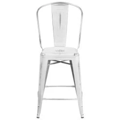 Instantly add an urban look and feel to your bar or tall table tops with this Flash Furniture ET-3534-24-WH-GG 24″ high distressed white metal counter height stool with vertical slat back and drain hole seat! While its curved, vertical slat back provides firm spinal support, the raised, drain hole seat is easy to clean and ensures guests are at a comfortable height to enjoy your signature drinks, appetizers, entrees, and desserts. It also features a convenient footrest to reduce the pressure on customers’ legs and lower backs and promote optimum relaxation. Made of sturdy metal, this counter height stool is durable enough to withstand years of use. Its under-seat cross brace provides additional stability, and its lightweight design allows for easy movement and transportation. Plus, it boasts protective rubber glides to help keep floor surfaces in pristine condition. With a white powder coat finish, this stool is sure to complement the theme of your indoor restaurant, bistro, or cafe. Overall Dimensions: Width: 17 3/4″ Depth: 22″ Height: 40 1/4″ Seat Width: 14″ Seat Depth: 14″ Seat Height (from floor): 24″ Back Width: 17 3/4″ Back Height: 17 1/4″ Weight Capacity: 330 lb.