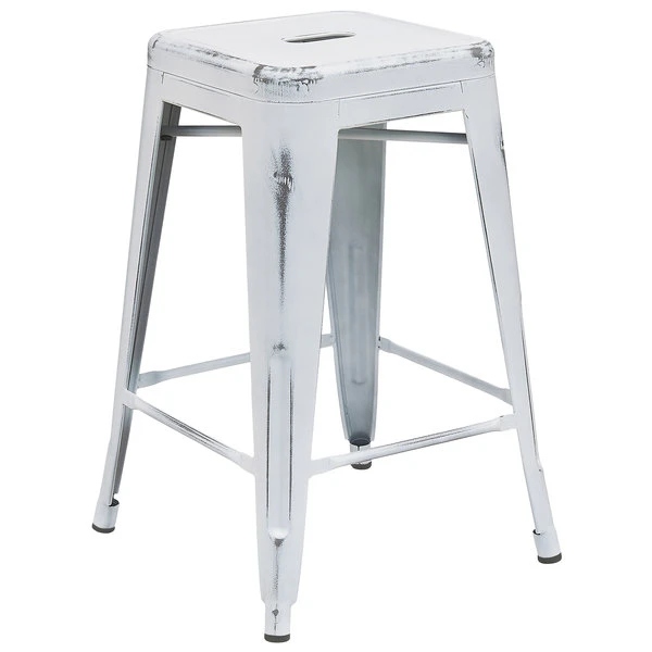Instantly add an urban look and feel to your bar or tall table tops with this Flash Furniture ET-BT3503-24-WH-GG 24″ high distressed white stackable metal counter height stool with drain hole seat! While the raised, drain hole seat is easy to clean and ensures guests are at a comfortable height to enjoy your signature drinks, appetizers, entrees, and desserts, the convenient footrest helps reduce the pressure on customers’ legs and lower backs to promote optimum relaxation. Plus, it can be stacked with up to 10 other stools to maximize storage space. Made of sturdy metal, this counter height stool is durable enough to withstand years of use. Its under-seat cross brace provides additional stability, and its lightweight design allows for easy movement and transportation. It also boasts protective rubber glides to help keep floor surfaces in pristine condition and has small, protective caps on the cross brace to protect the finish from scratches and chips while being stacked. With a white powder coat finish, this stool is sure to complement the theme of your indoor restaurant, bistro, or cafe. Overall Dimensions: Width: 16″ Depth: 16″ Height: 24″ Seat Width: 12″ Seat Depth: 12″ Weight Capacity: 330 lb.