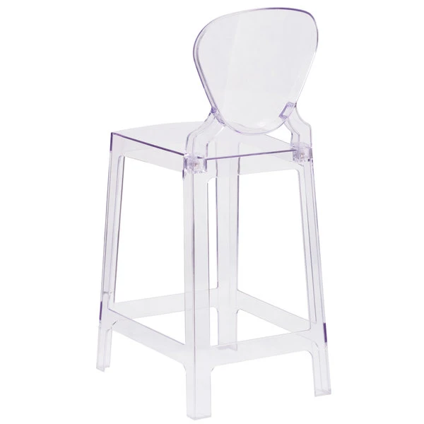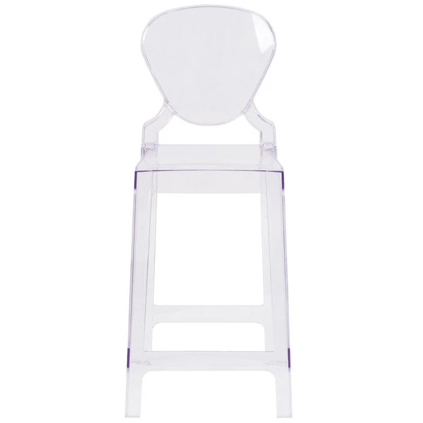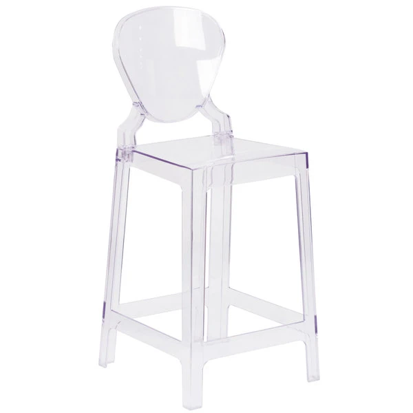Outfit your modern indoor or outdoor dining area with this Flash Furniture OW-TEARBACK-24-GG Ghost transparent polycarbonate counter height with a tear back. The raised seat ensures guests are at a comfortable height to enjoy your signature drinks, appetizers, entrees, and desserts at your counter or bar. Meanwhile, the convenient footrest helps reduce the pressure on customers’ legs and lower backs to promote optimum relaxation. The transparent design emphasizes your business’ color scheme with a subtle, sleek presence and is great for catered events or weddings. A sturdy polycarbonate construction is designed for both indoor and outdoor use for versatility. For the convenience of your operation, the chair features 4 rubber glides, which help it to move smoothly over a variety of surfaces and prevent scratching. It boasts a 330 lb. weight capacity and a comfortable tear shaped back for optimal comfort. Provide convenient, stylish seating in your facility with this chair! Overall Dimensions: Width: 16 1/2″ Depth: 19 3/4″ Height: 39″ Seat Dimensions: Width: 14 1/2″ Depth: 15 1/2″ Height: 25″ Back Dimensions: Width: 14″ Height: 14 1/2″