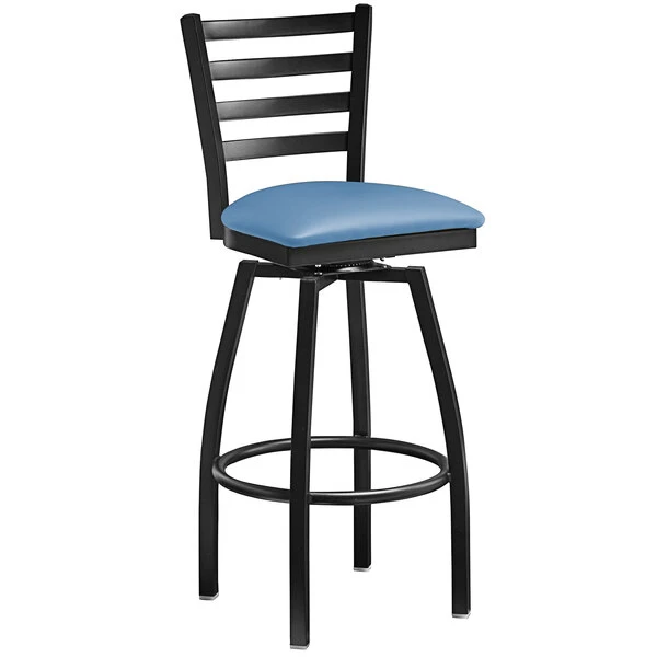 Seat your guests in comfort and style with this Lancaster Table & Seating black ladder back swivel bar height chair with blue padded seat. This bar height chair has a sleek and sturdy metal frame along with a comfortable and soft 2 1/2″ thick vinyl padded seat. Its back rest features a trendy ladder design that adds a modern look to any location. Because it is contoured for a customer’s back, it provides unmatched comfort while maintaining a distinct appearance. The swivel design and foot rest allow patrons to turn in their chairs to comfortably socialize and fully enjoy your venue. This bar height chair is designed with integrated plastic glides to protect your floors from scuffing. The black powder coat on the frame adds a modern touch and ensures longevity even through everyday wear and tear – resisting stains, scratches, and smudges. This reliable design ensures you’ll be using this bar height chair in your bar or restaurant for years to come! Overall Dimensions: Height: 44 1/2″ Seat Width: 16 3/4″ Seat Depth: 16 1/2″ Seat Height: 31 1/2″ Capacity: 300 lb.