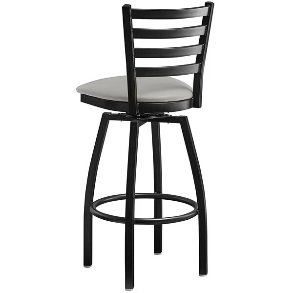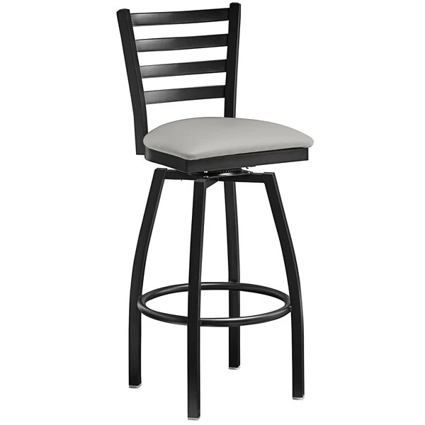 Seat your guests in comfort and style with this Lancaster Table & Seating black ladder back swivel bar height chair with light gray padded seat. This bar height chair has a sleek and sturdy metal frame along with a comfortable and soft 2 1/2″ thick vinyl padded seat. Its back rest features a trendy ladder design that adds a modern look to any location. Because it is contoured for a customer’s back, it provides unmatched comfort while maintaining a distinct appearance. The swivel design and foot rest allow patrons to turn in their chairs to comfortably socialize and fully enjoy your venue. This bar height chair is designed with integrated plastic glides to protect your floors from scuffing. The black powder coat on the frame adds a modern touch and ensures longevity even through everyday wear and tear – resisting stains, scratches, and smudges. This reliable design ensures you’ll be using this bar height chair in your bar or restaurant for years to come! Overall Dimensions: Height: 44 1/2″ Seat Width: 16 3/4″ Seat Depth: 16 1/2″ Seat Height: 31 1/2″ Capacity: 300 lb.
