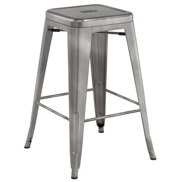 Take your modern restaurant, cafe, or bistro to the next level with this Lancaster Table & Seating Alloy Series clear coated stackable metal indoor industrial cafe counter height stool with drain hole seat. Made with a durable steel construction, it has been given a clear powder coating to further enhance durability so you can rest assured that this counter height barstool is sure to withstand years of use. The frame is reinforced with additional under-seat cross bracing to provide strength and stability without adding extra bulk or weight to this sleek design. It’s lightweight enough for easy movement and transportation so you can quickly reconfigure your dining space and easily clean up at the end of the night. It can even be stacked to maximize storage space if needed! To ensure that your customers are free to enjoy your signature drinks, appetizers, entrees, and desserts, this industrial counter height barstool features a comfortable seat with a raised, rounded lip and footrest to reduce pressure on your customers’ legs and lower backs. The drain hole ensures that water won’t pool on the seat, helping it to dry faster after washing or accidental spills. To keep this stool looking clean, simply wipe with a damp cloth and your preferred all-purpose cleaner. It’s also equipped with protective glides that help keep floor surfaces in pristine condition, making it an excellent choice for your indoor dining area. Overall Dimensions: Width: 16 1/8″ Depth: 16 1/8″ Height: 24″ Seat Width: 12 1/4″ Seat Depth: 12 1/4″ Weight Capacity: 400 lb.