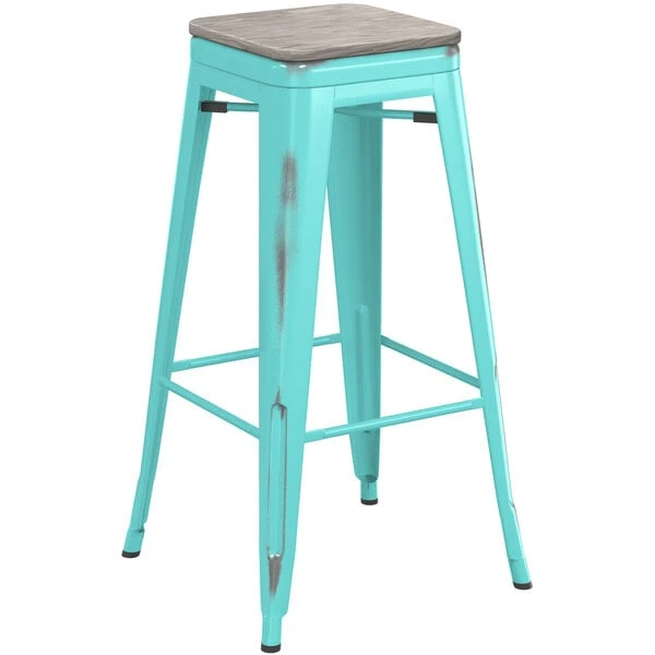 Take your modern restaurant, cafe, or bistro to the next level with this Lancaster Table & Seating Alloy Series distressed seafoam metal indoor industrial cafe bar height stool with gray wood seat. Made with a durable steel construction, the frame has received an e-coating to seal it against rust. This treatment was followed with a distressed seafoam powder coating to further enhance durability so you can rest assured that this bar height barstool is sure to withstand years of use. It features a footrest to reduce pressure on your customers’ legs and lower backs. The frame is reinforced with an additional under-seat cross bracing to provide strength and stability without adding extra bulk or weight to this sleek design. It’s lightweight enough for easy movement and transportation so you can quickly reconfigure your dining space and easily clean up at the end of the night. And it can even be stacked to maximize storage space if needed! To ensure that your customers are free to enjoy your signature drinks, appetizers, entrees, and desserts, this industrial bar height stool features a comfortable wooden seat that has been stained with a gray finish that enhances the appearance of the natural wood grain. To keep this stool looking clean, simply wipe it with a damp cloth and your preferred all-purpose cleaner. It is also equipped with protective glides that help keep floor surfaces in pristine condition, making it an excellent choice for your indoor dining area. This item comes with the seat detached to save on shipping costs. All hardware for assembly is included. Overall Dimensions: Width: 16 1/8″ Depth: 16 1/8″ Height: 30 3/4″ Seat Width: 12 1/8″ Seat Depth: 12 1/8″ Weight Capacity: 400 lb.