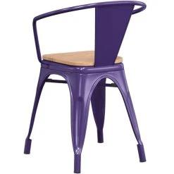 Take your restaurant, cafe, or bistro to the next level with this Lancaster Table & Seating Alloy Series purple metal indoor industrial cafe arm chair with natural wood seat. Made with a steel construction, it has received an e-coating to seal it against rust. This treatment was followed with a purple powder coating to further enhance durability so you can rest assured that this cafe chair is sure to withstand years of use. The frame is reinforced with additional under-seat cross bracing to provide strength and stability without adding extra bulk or weight to this sleek design. It’s lightweight enough for easy movement and transportation so you can quickly reconfigure your dining space and easily clean up at the end of the night. It can even be stacked to maximize storage space if needed! To ensure that your customers are free to enjoy your signature drinks, appetizers, entrees, and desserts, this industrial chair features a comfortable wooden seat that has been painted with a natural wood finish for a clean, even look, as well as a supportive back and a comfortable seat with a rounded lip to reduce pressure on your customers’ legs and lower backs. Solid arms add extra comfort, allowing your guests to relax and enjoy their meal. To keep this chair looking clean, simply wipe with a damp cloth and your preferred mild all purpose cleaner. This chair is an excellent choice for your indoor dining area. Overall Dimensions: Width: 17 5/16″ Depth: 17″ Height: 28 1/2″ Seat Width: 14 1/8″ Seat Depth: 14 1/2″ Seat Height: 17 3/4″ Capacity: 400 lb.
