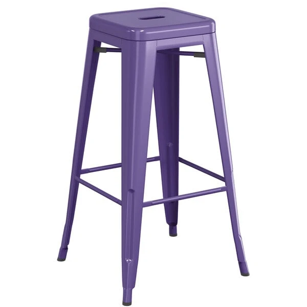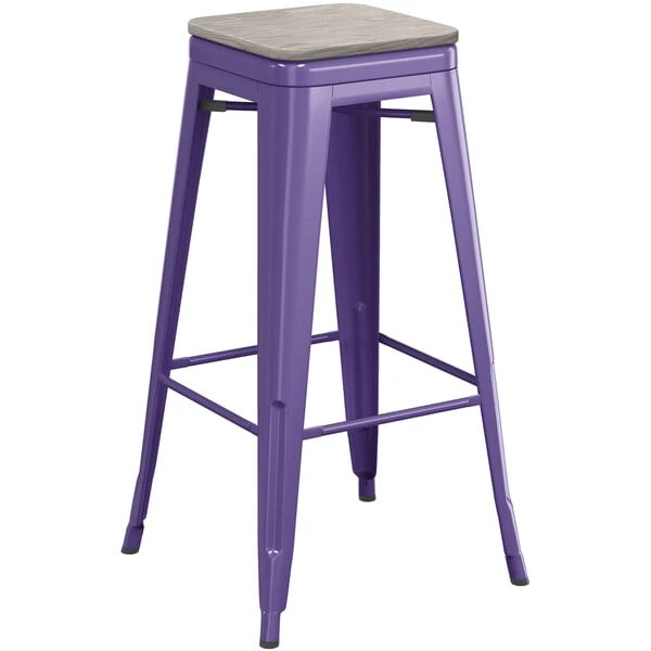 Take your modern restaurant, cafe, or bistro to the next level with this Lancaster Table & Seating Alloy Series purple metal indoor industrial cafe bar height stool with gray wood seat. Made with a durable steel construction, the frame has received an e-coating to seal it against rust. This treatment was followed with a purple powder coating to further enhance durability so you can rest assured that this bar height barstool is sure to withstand years of use. It features a footrest to reduce pressure on your customers’ legs and lower backs. The frame is reinforced with an additional under-seat cross bracing to provide strength and stability without adding extra bulk or weight to this sleek design. It’s lightweight enough for easy movement and transportation so you can quickly reconfigure your dining space and easily clean up at the end of the night. And it can even be stacked to maximize storage space if needed! To ensure that your customers are free to enjoy your signature drinks, appetizers, entrees, and desserts, this industrial bar height stool features a comfortable wooden seat that has been stained with a gray finish that enhances the appearance of the natural wood grain. To keep this stool looking clean, simply wipe it with a damp cloth and your preferred all purpose cleaner. It is also equipped with protective glides that help keep floor surfaces in pristine condition, making it an excellent choice for your indoor dining area. This item comes with the seat detached to save on shipping costs. All hardware for assembly is included. Overall Dimensions: Width: 16 1/8″ Depth: 16 1/8″ Height: 30 3/4″ Seat Width: 12 1/8″ Seat Depth: 12 1/8″ Weight Capacity: 400 lb.