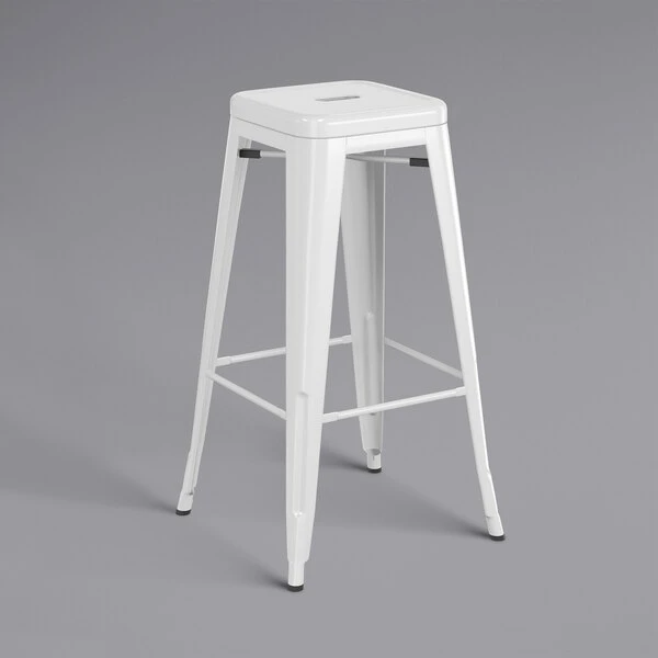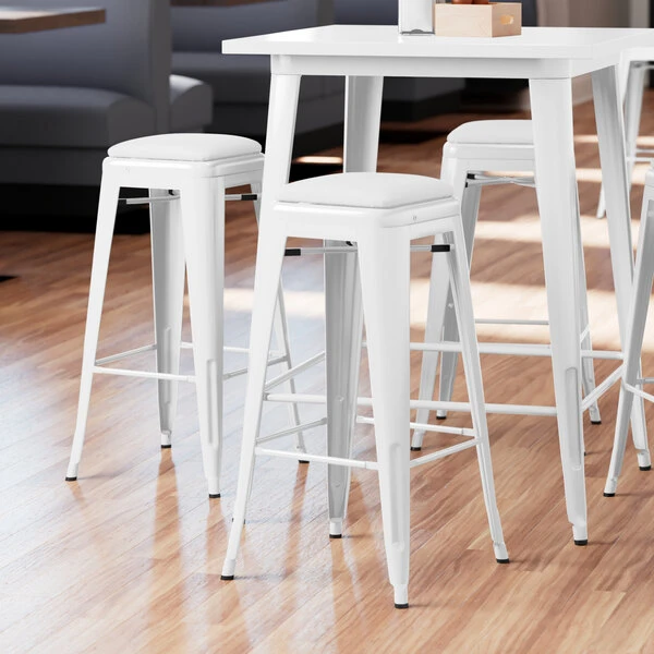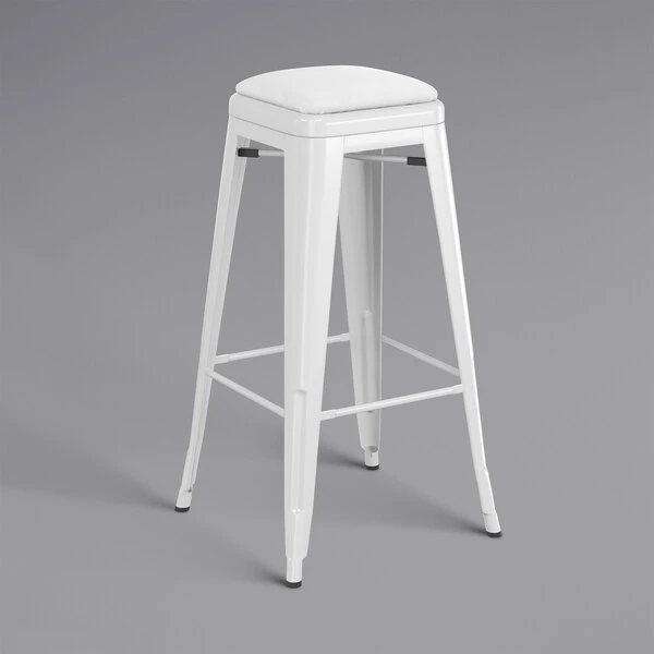 Take your modern restaurant, cafe, or bistro to the next level with this Lancaster Table & Seating Alloy Series white metal indoor barstool with white vinyl cushion. Made with a durable steel construction, the barstool has received an e-coating to seal it against rust. This treatment was followed with a white coating to further enhance durability so you can rest assured that this barstool is sure to withstand years of use. The frame is reinforced with additional under-seat cross bracing to provide strength and stability without adding extra bulk or weight to this sleek design. It’s lightweight enough for easy movement and transportation, and it can be stacked to maximize storage space if needed. To ensure that your customers are free to enjoy your signature drinks, appetizers, entrees, and desserts in comfort, a vinyl cushion is included. This cushion easily screws to the seat. Adding a layer of foam between your guests and their seats will provide a measure of luxury, enticing them to stay longer and enjoy more. Aside from the comfort, each cushion is made with CAL117, flame-resistant foam, decelerating the potential of smoldering spread to ensure the safety of your guests, employees, and establishment. Additionally, the barstool offers a comfortable seat with a raised, rounded lip and footrest to reduce pressure on your customers’ legs and lower backs. To keep this stool looking clean, simply wipe with a damp cloth and your preferred all purpose cleaner. It’s also equipped with protective glides that help keep floor surfaces in pristine condition, making it an excellent choice for your indoor dining area. Maintain a classy, modern aesthetic in your establishment with this barstool and cushion set! Includes: – (1) barstool – (1) vinyl cushion Barstool Dimensions: Width: 16 1/8″ Depth: 16 1/8″ Height: 30″ Seat Width: 12 1/4″ Seat Depth: 12 1/4″ Weight Capacity: 400 lb. Cushion Dimensions: Width: 11″ Depth: 11″ Thickness: 2 1/2″