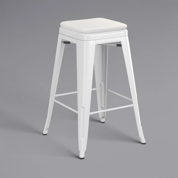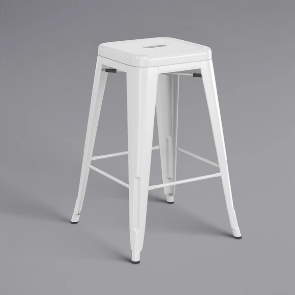 Take your modern restaurant, cafe, or bistro to the next level with this Lancaster Table & Seating Alloy Series white stackable metal indoor / outdoor industrial cafe counter height stool with gray fabric magnetic cushion. Made with a durable steel construction, the stool has received an e-coating to seal it against rust. This treatment was followed with a white powder coating to further enhance durability so you can rest assured that this stool is sure to withstand years of use. The frame is reinforced with additional under-seat cross bracing to provide strength and stability without adding extra bulk or weight to this sleek design. It’s lightweight enough for easy movement and transportation, and it can be stacked to maximize storage space if needed. To ensure that your customers are free to enjoy your signature drinks, appetizers, entrees, and desserts in comfort, a fabric cushion is included. This cushion magnetically connects to the seat and is water-resistant for use both indoors and outdoors. Adding a layer of foam between your guests and their seats will provide a measure of luxury, enticing them to stay longer and enjoy more. Aside from the comfort, each cushion is made with CAL117, flame-resistant foam, decelerating the potential of smoldering spread to ensure the safety of your guests, employees, and establishment. Additionally, the stool boasts a footrest to reduce pressure on your customers’ legs and lower backs. A built-in drain hole ensures that water won’t pool on the seat, helping it to dry faster after washing or accidental spills. To keep this stool looking clean, simply wipe with a damp cloth and your preferred all purpose cleaner. It’s also equipped with protective glides that help keep floor surfaces in pristine condition, making it an excellent choice for your indoor or outdoor dining area. Maintain a classy, modern aesthetic in your establishment with this chair and cushion set! Includes: – (1) stool – (1) fabric cushion stool Dimensions: Width: 16 1/8″ Depth: 16 1/8″ Height: 24″ Seat Width: 12 1/4″ Seat Depth: 12 1/4″ Weight Capacity: 400 lb. Cushion Dimensions: Length: 12″ Width: 12″ Thickness: 1 1/4″