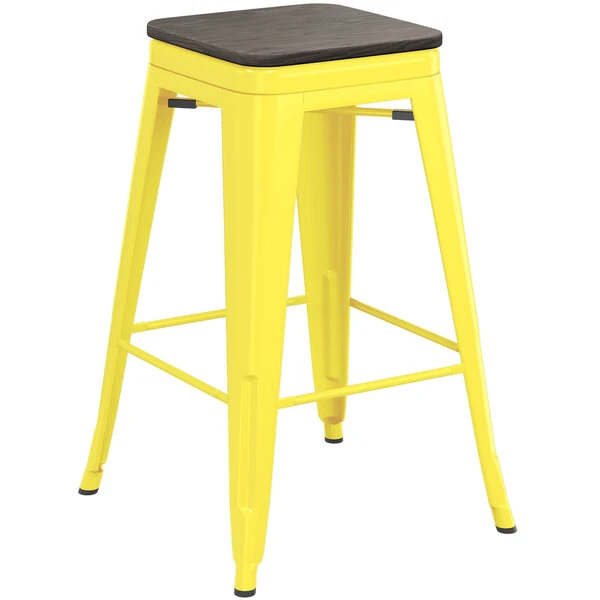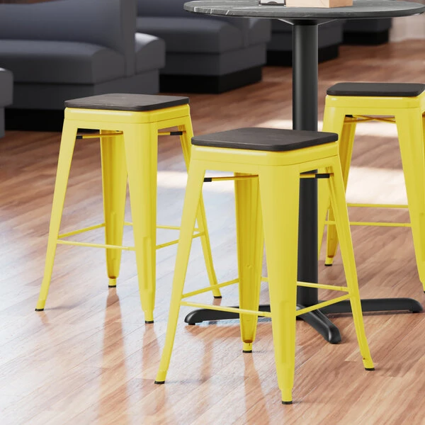 Take your modern restaurant, cafe, or bistro to the next level with this Lancaster Table & Seating Alloy Series yellow metal indoor industrial cafe counter height stool with black wood seat! The eye-catching bright yellow color adds a unique look to your dining area, while the comfortable design will keep guests content.