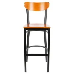 Seat your guests in comfort and style with this Lancaster Table & Seating Boomerang bar height chair with a cherry seat and back. The Boomerang chair is both sturdy and stylish, instilling a modern look in any location. Its reliable and modern design ensures you’ll be using this bar height chair in your pub or restaurant for years to come.