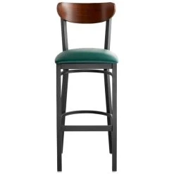 This Lancaster Table & Seating Boomerang bar height black chair has a contemporary steel frame along with a comfortable green vinyl seat and trendy antique walnut back. This reliable and modern design ensures you’ll be using this bar height chair in your pub or restaurant for years to come
