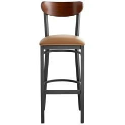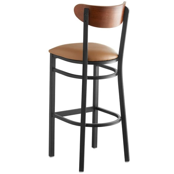 This Lancaster Table & Seating Boomerang bar height black chair has a contemporary steel frame along with a comfortable light brown vinyl seat and trendy antique walnut back. This reliable and modern design ensures you’ll be using this bar height chair in your pub or restaurant for years to come