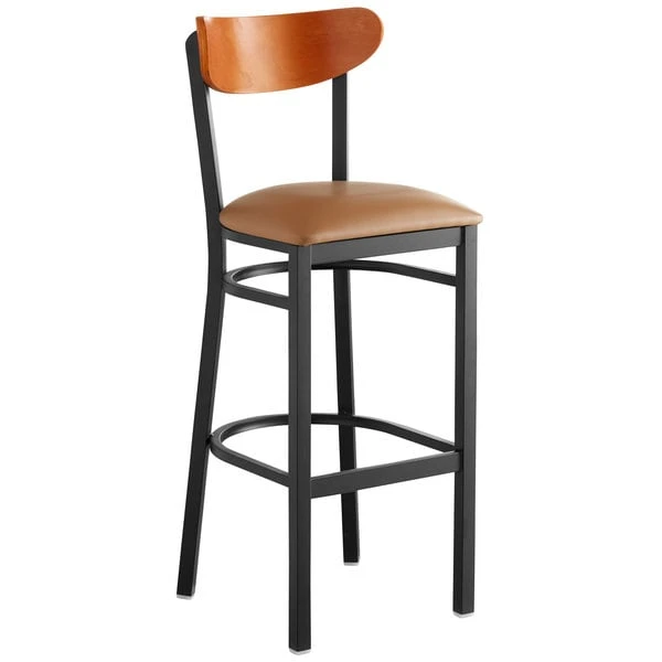 This Lancaster Table & Seating Boomerang bar height black chair has a contemporary steel frame along with a comfortable light brown vinyl seat and trendy cherry back. This reliable and modern design ensures you’ll be using this bar height chair in your pub or restaurant for years to come